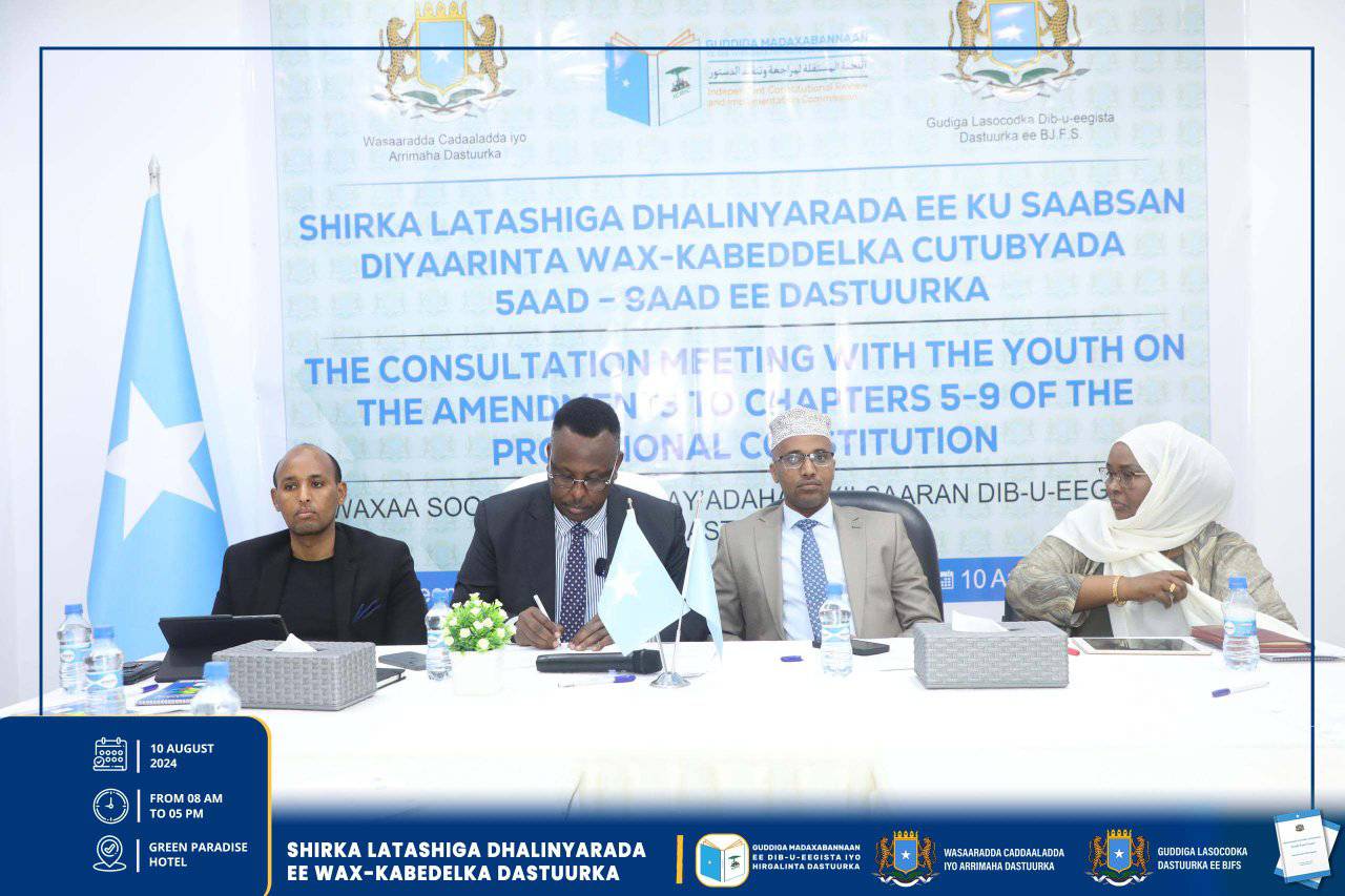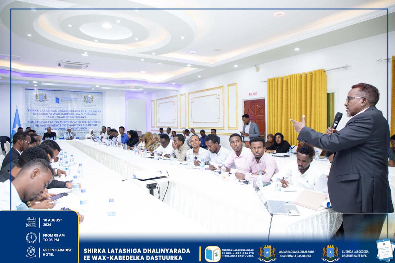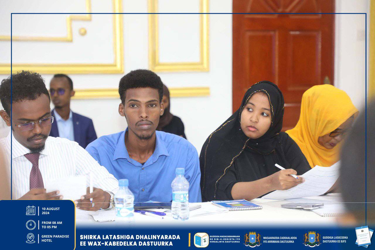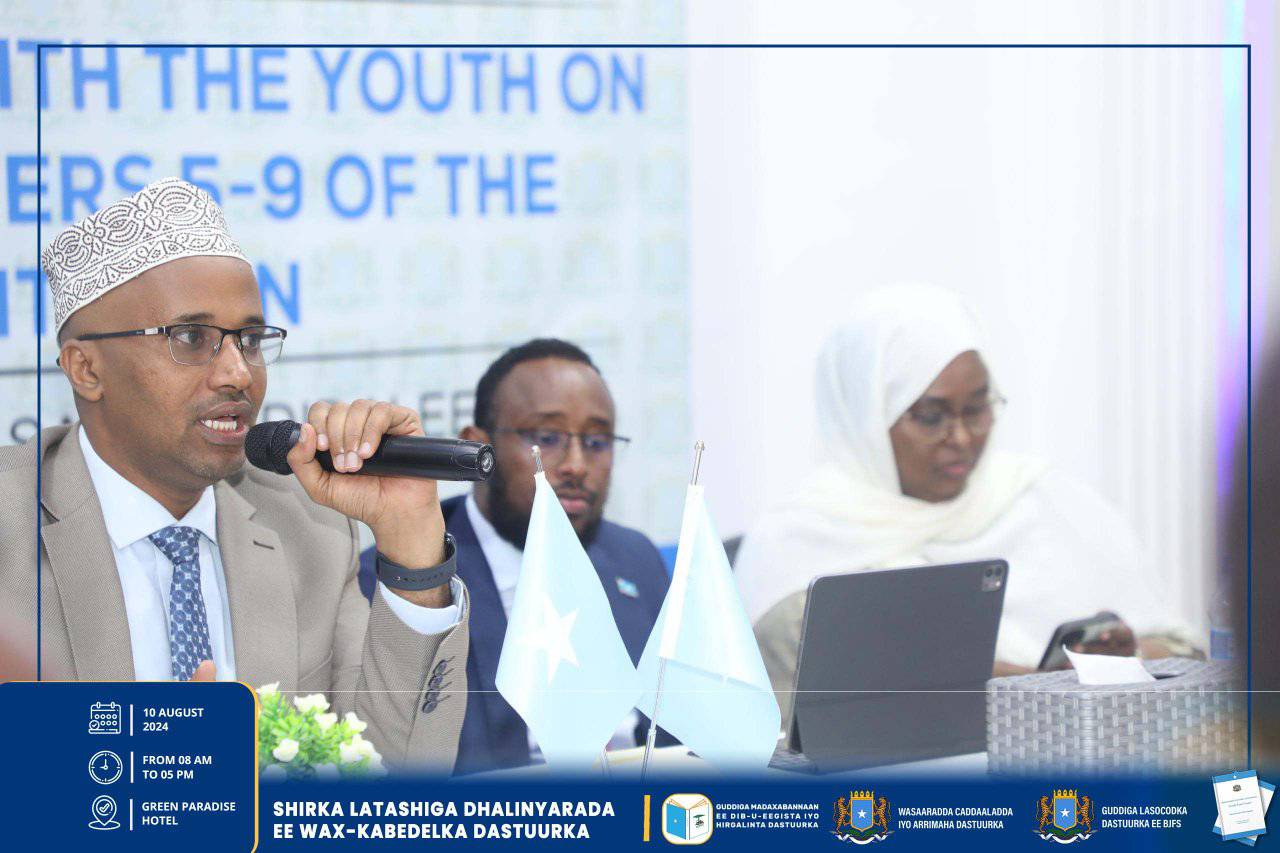 Muqdisho, Agoosto 10, 2024 – Hay’addaha u Xilsaaran dib-u-Eegista dastuurka oo kala ah, Guddiga Madaxabannaan ee Dib-u-eegista iyo Hirgelinta Dastuurka, Guddiga Lasocodka Dastuurka ee Baarlamaanka iyo Wasaaradda Cadaaladda iyo Arr. Dastuurka oo wada latashiyada qaybaha kala duwan ee bulshada ayaa maalintii seddexaad la shiray Dhalinyaradda Soomaaliyeed, ayadoo shirkaasi lagu soo bandhigay soojeedin kooban oo ku saabsan cutubka 5aad ilaa 9aad ee dastuurka iyo su’aalo khuseeya isla