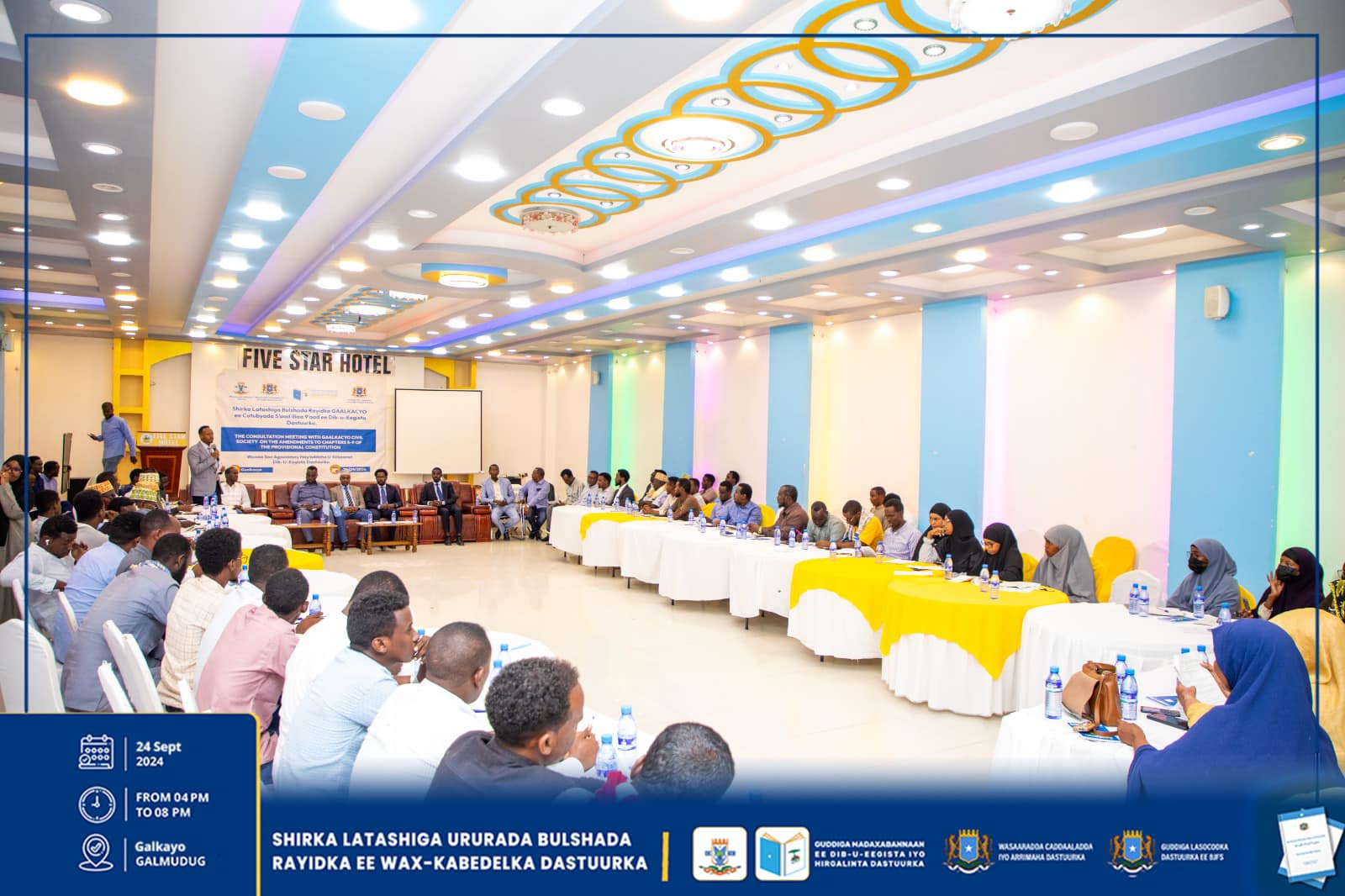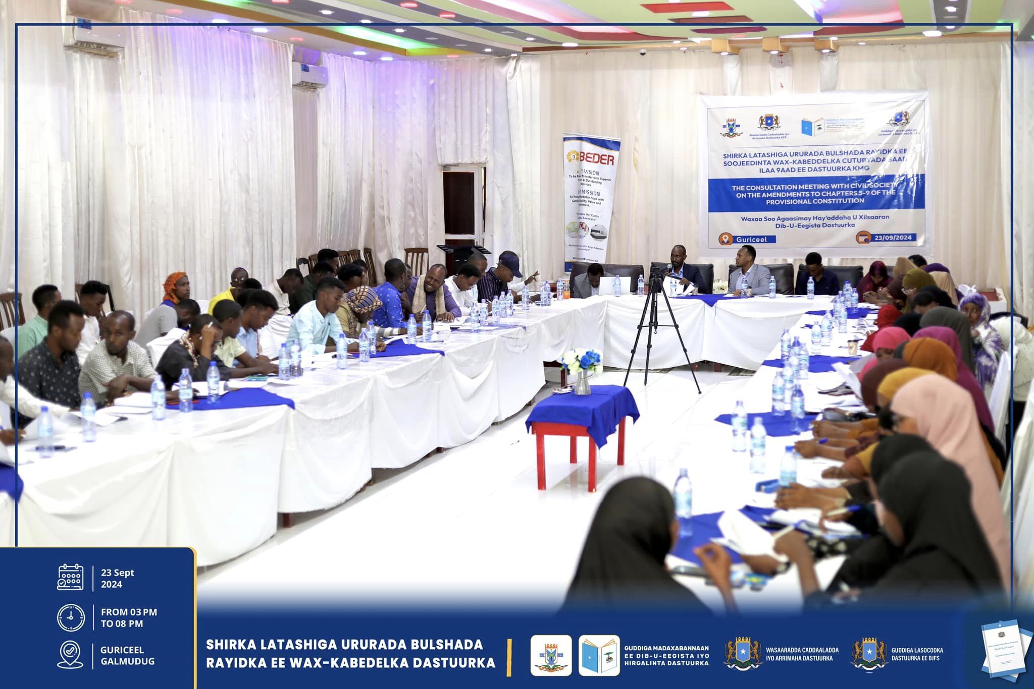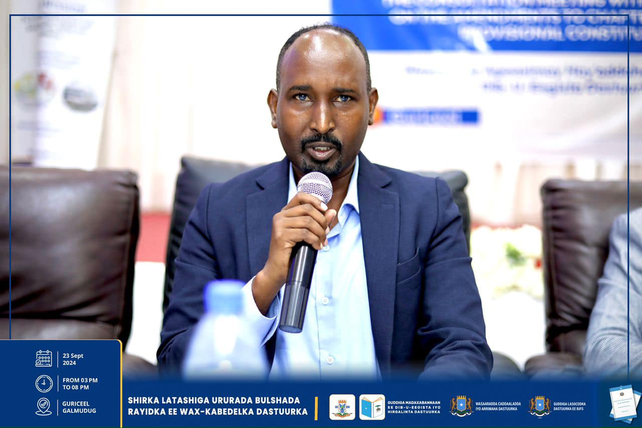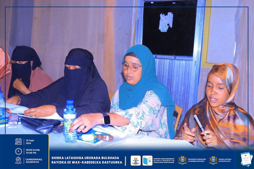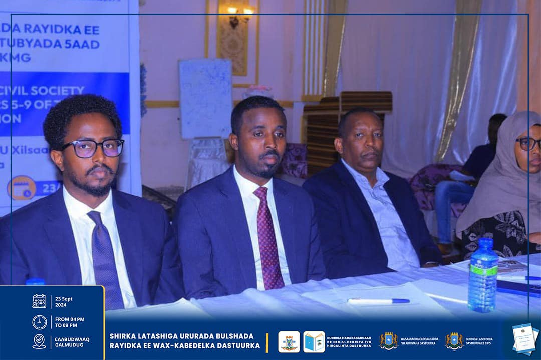 Dhuusamareeb, Sebtember 23-25, 2024: Guddiga Madaxabannaan ee Dib-u-eegista iyo Hirgelinta Dastuurka iyo Hay’adaha kale ee u xilsaaran arrimaha Dastuurka ayaa magaaloyinka Guriceel, Caabudwaaq iyo Gaalkacyo ku qabtay shirar latashiyo ku saabsan dib-u-eegista wax-kabeddelka cutubyada 5aad ilaa 9aad ee Dastuurka.