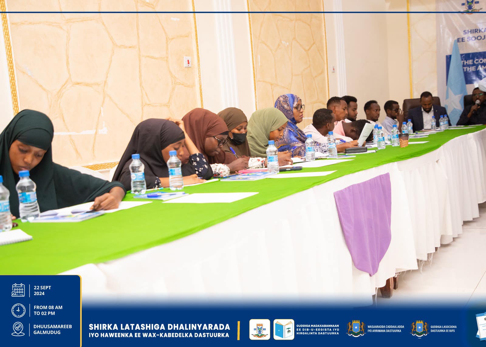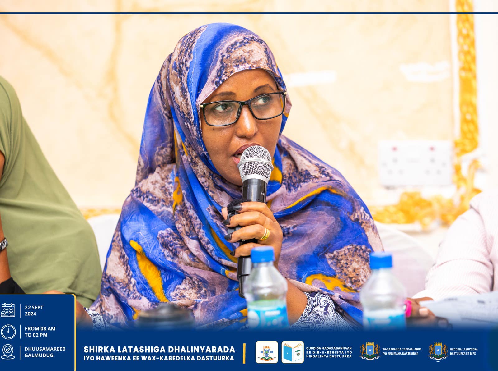 Dhuusamareeb, Sebteember 22, 2024 , hay’adaha u xilsaaran Dib-u-eegista Dastuurka ee kala ah, Guddiga Madaxabannaan ee Dib-u-eegista iyo Hirgelinta Dastuurka, Guddiga Lasocodka Dastuurka ee Baarlamaanka iyo Wasaaradda Cadaaladda iyo Arr. Dastuurka, ayaa maalintii labaad si wadajir ah uga daahfuray Shirka Latashiga Dhalinyarada iyo Haweenka Galmudug ee ku saabsan diyaarinta Wax-kabeddelka Cutubyada 5aad – 9aad ee Dastuurka KMG ah.